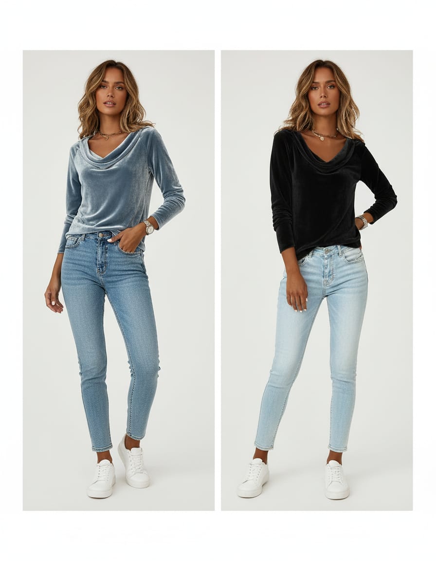 Il tessuto in velluto di alta qualità cattura la luce, offrendo una lucentezza ricca e sofisticata. Il design distintivo con lo scollo a cascata (o scollo drappeggiato) crea un effetto morbido e fluido sul décolleté, aggiungendo un'immediata nota di raffinatezza al tuo look.